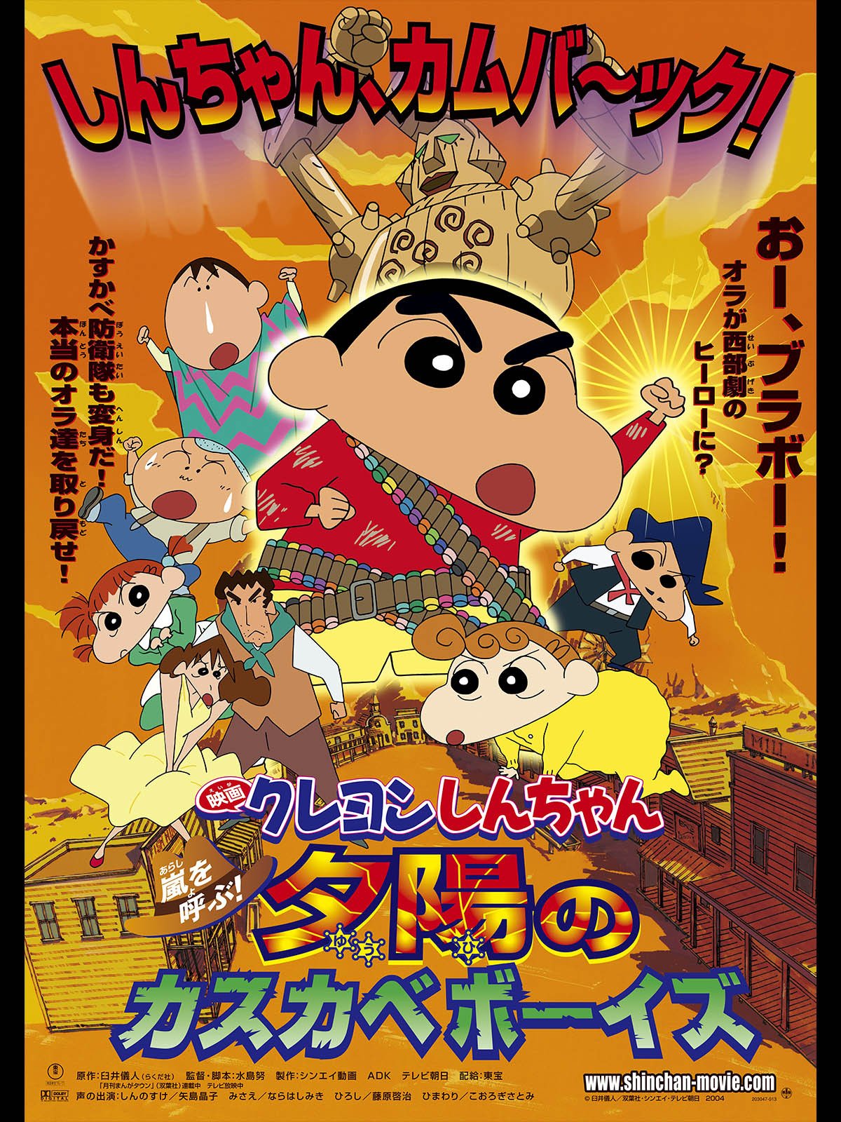 Crayon Shin-chan: Fierceness That Invites Storm! The Kasukabe Boys of the Evening Sun (クレヨンしんちゃん 嵐を呼ぶ!夕陽のカスカベボーイズ Kureyon Shinchan: Arashi o Yobu! Yūhi no Kasukabe Bōizu), also known as Shin Chan the Western: the Adventures of the Kasukabe Boys, is a 2004 anime film. It is the 12th film based on the popular comedy manga and anime series Crayon Shin-chan. The film was released to theatres on April 17, 2004 in Japan. It was released as Crayon Shinchan The Movie: Evening Sun Kasukabe Boys with English subtitles on VCD and DVD by PMP Entertainment.