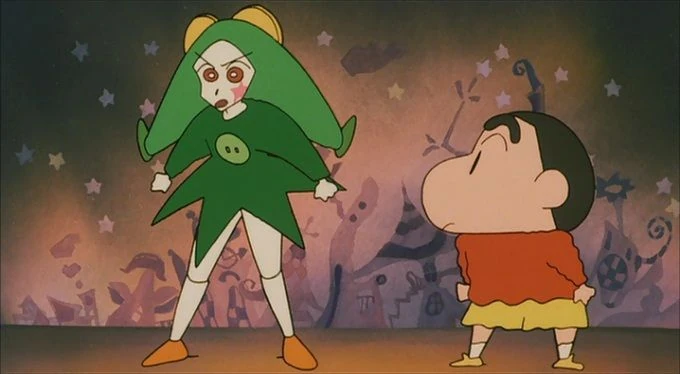 But when Joma and Makao seemed to have some evil intention Shin-chan used the Joker card and came out Majin, the spirit of wild, who stopped him and explained that to defeat Joma and Makao he must reach the top of the castle and place the Joker card in the center of the park. After a great persecution, Makao and Joma are destroyed and the castle begins to crumble. Luckily they reached an emergency airlock and escaped. Then Snowman Par apparently came to attack but princess Memory Mimori casts a spell. The Snowman melts and was discovered that it was the prince. She said that she was actually Toppema and thanked Shinnosuke for his help by him a kiss on his cheek. Then the princess and prince marry happily and Henderland becomes a happy place again.